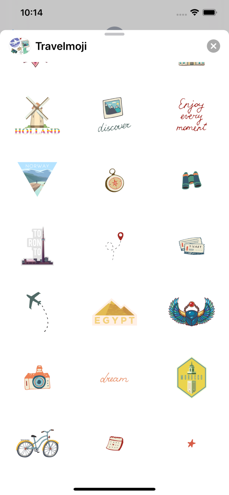 Travelmoji are a fun way to update friends and family about your travels, and can even be used during a FaceTime! Press and hold any of these 80 unique travel stickers, when they peel off place them anywhere in a conversation!
